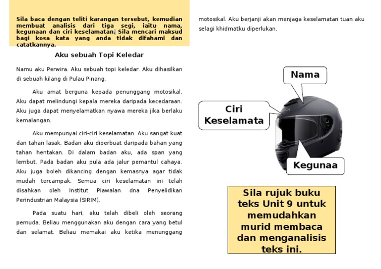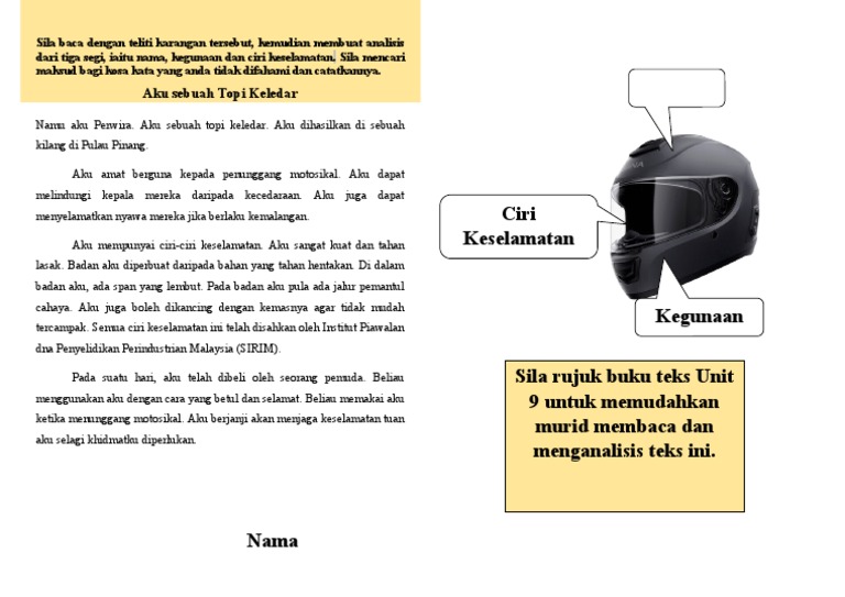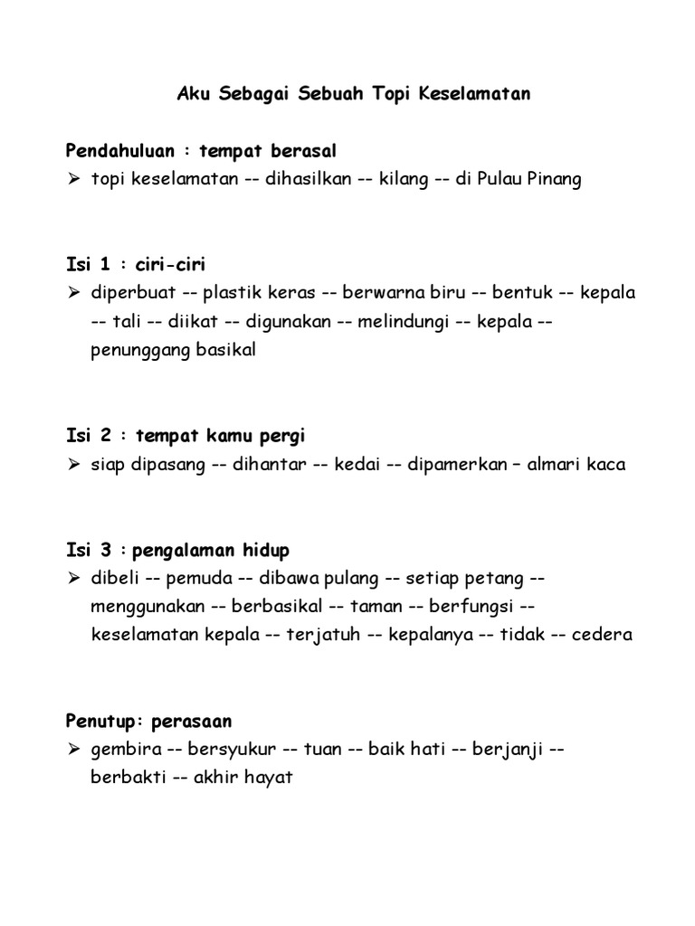 . He taught me how to ride a bike. Karangan Kemalangan Jalan Raya. Aku Sebuah Topi Keledar P - Nama Perwira - sebuah topi keledar - dihasilkan kilang Isi 1 - berguna pengguna motosikal - Melindungi kepala mereka - kecederaan - - menyelamatkan nyawa mereka kemalangan Isi 2 mempunyai ciri-ciri keselamatan - - sangat kuat - tahan lasak - diperbuat daripada bahan - tahan hetakan--di dalam badan aku span lembut.